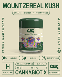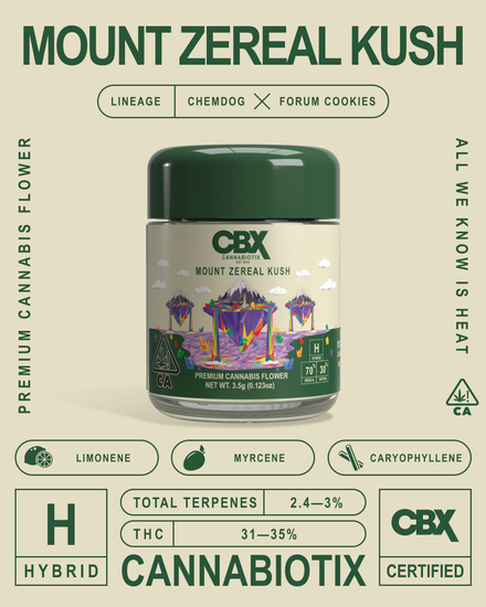 • Mount Zereal Kush is a CBX original — a cross of their beloved Kush Mountains and Zereal Milk (Pheno #40). Purple and light green buds frosted with crystals deliver a complex blend of creamy, gassy, and sweet with old-school fuel on the back end. The high is smooth and cozy, leaving you relaxed and floating somewhere above it all.