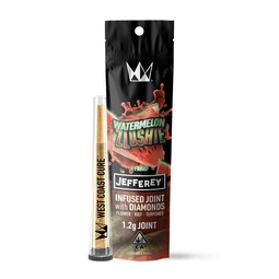 The Watermelon Zlushie Jefferey Single is a 1.2-gram powerhouse of a pre-roll, expertly crafted for those who crave quality. Rolled with WCC’s top-tier whole nug flower, this joint is supercharged with visible THCa diamonds, high-end kief, and subtly enhanced with all-natural terpenes. No trim, shake, or old flower here—just green, frosty goodness ground in-house in small batches for optimal freshness.